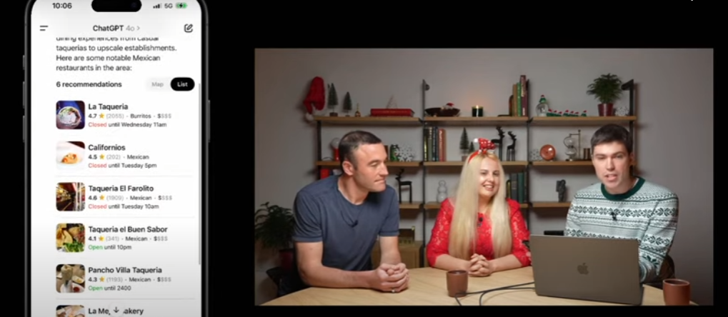 Al fin se habilitó la funcionalidad de visión para el nuevo modo de voz. Ahora es posible compartir con el modo de voz imágenes tomadas de la cámara del dispositivo, lo que ofrece una interacción muchísimo más natural para el usuario no avanzado. Por otra parte, este día se habilitó temporalmente un modo de voz especial donde el usuario podía conversar con Santa, para celebrar la época navideña.
